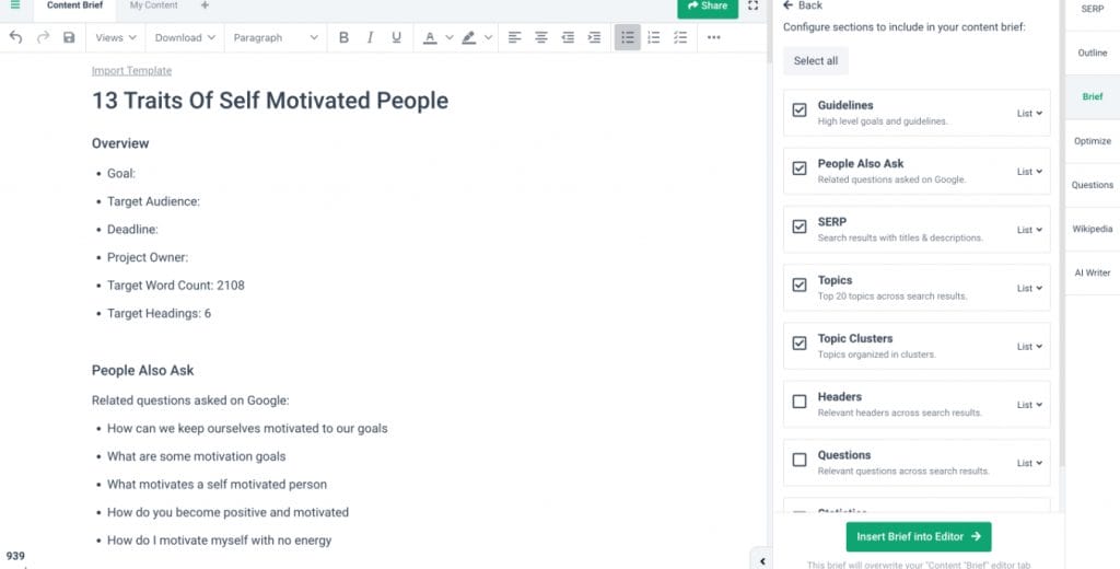 What a difference, now I was able to pull together a comprehensive content outline and brief in just a few minutes.