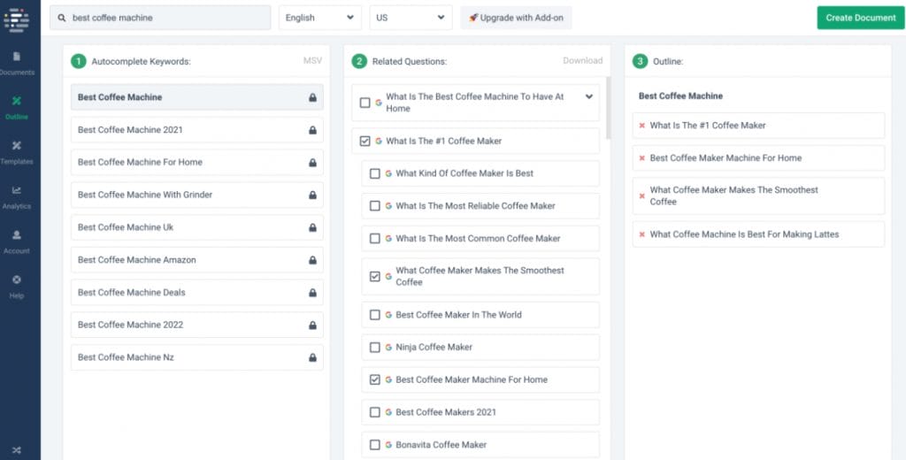 From this ‘Questions' page within Frase, you can then simply point-and-click to quickly generate an article outline and brief!