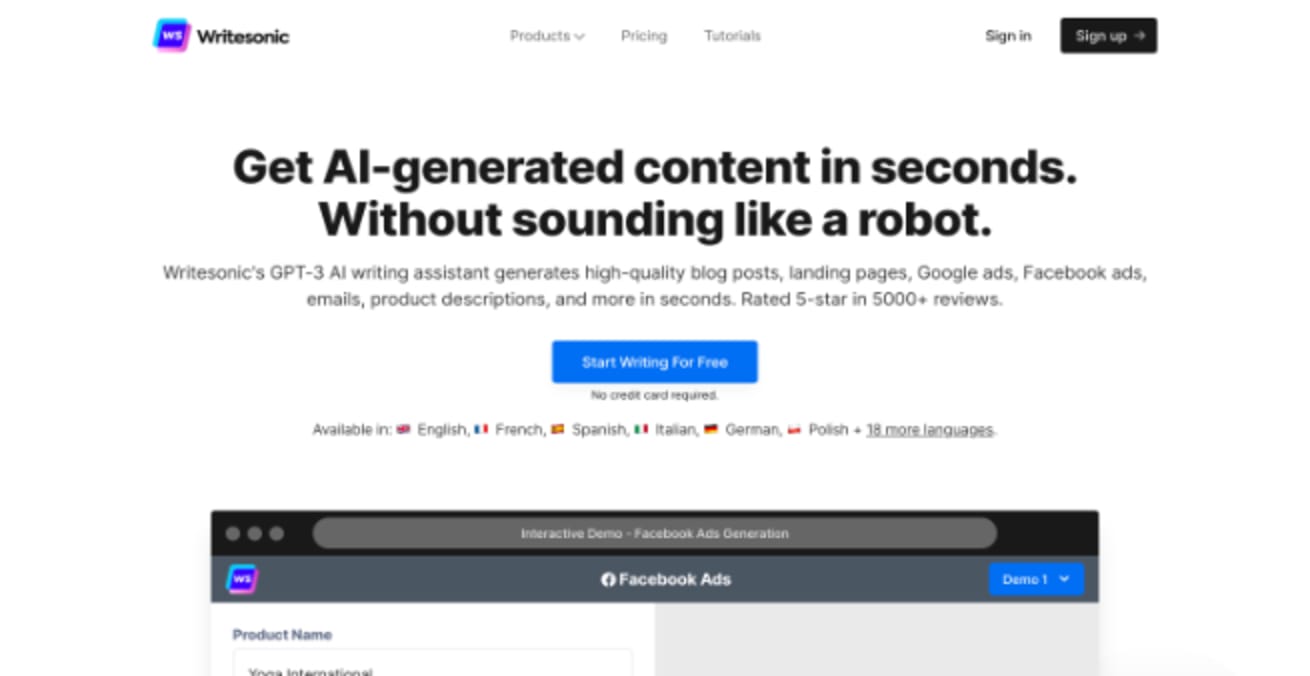 In seconds, Writesonic's GPT-3 AI writing assistant produces high-quality blog entries, landing pages, Google advertising, Facebook advertising, emails, product descriptions, and other internet content.