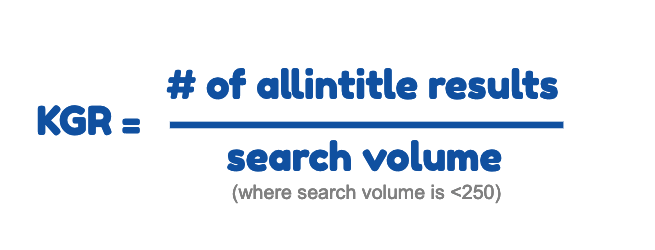 As a quick guide, if you have keyword term with a search volume of 250, the number of “allintitle” results would need to come in at 63 or less to give a KGR of 0.25.