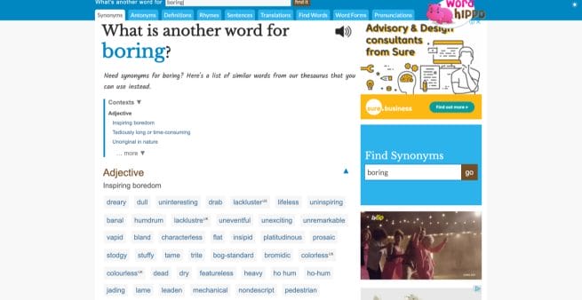 You'll see above, that WordHippo tells me I could switch out the word ‘boring' and replace it with say ‘vapid' which is much more attention grabbing.